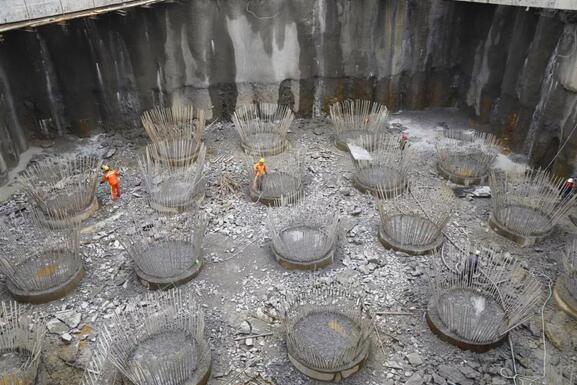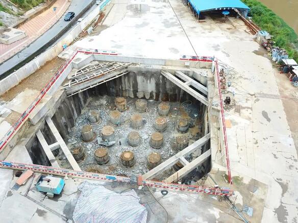 8月24日,繼龍巖大道高架橋主橋主塔樁基、承臺基坑開挖完成后項目已進入主塔承臺施工階段主橋封底混凝土澆筑完成0.75米(共1.5米)主橋轉體關鍵設備鑄鋼球鉸已生產(chǎn)完成現(xiàn)場正進行樁頭破除作業(yè)。由于連續(xù)橫跨贛龍鐵路、龍廈鐵路、羅龍東路、龍津河、雙洋路,主橋采用不對稱跨塔梁同時轉體施工,其轉體總重達2.366萬噸,轉體懸臂173.75m,施工難度巨大。為避免對城市道路及鐵路運行的影響,主橋將采用不對稱跨塔梁施工并分二次轉體,下一步進行控制性工程為兩次主塔轉體施工。