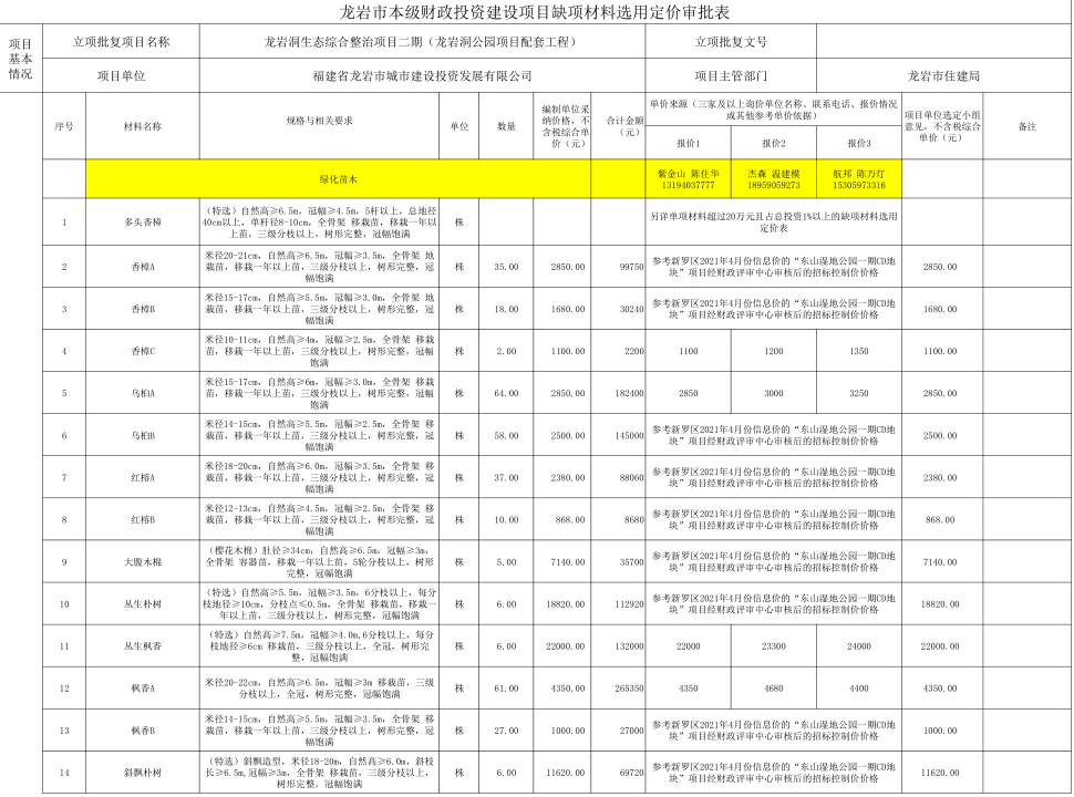 龍巖洞生態綜合整治二期(龍巖洞公園項目配套工程)缺項材料公示